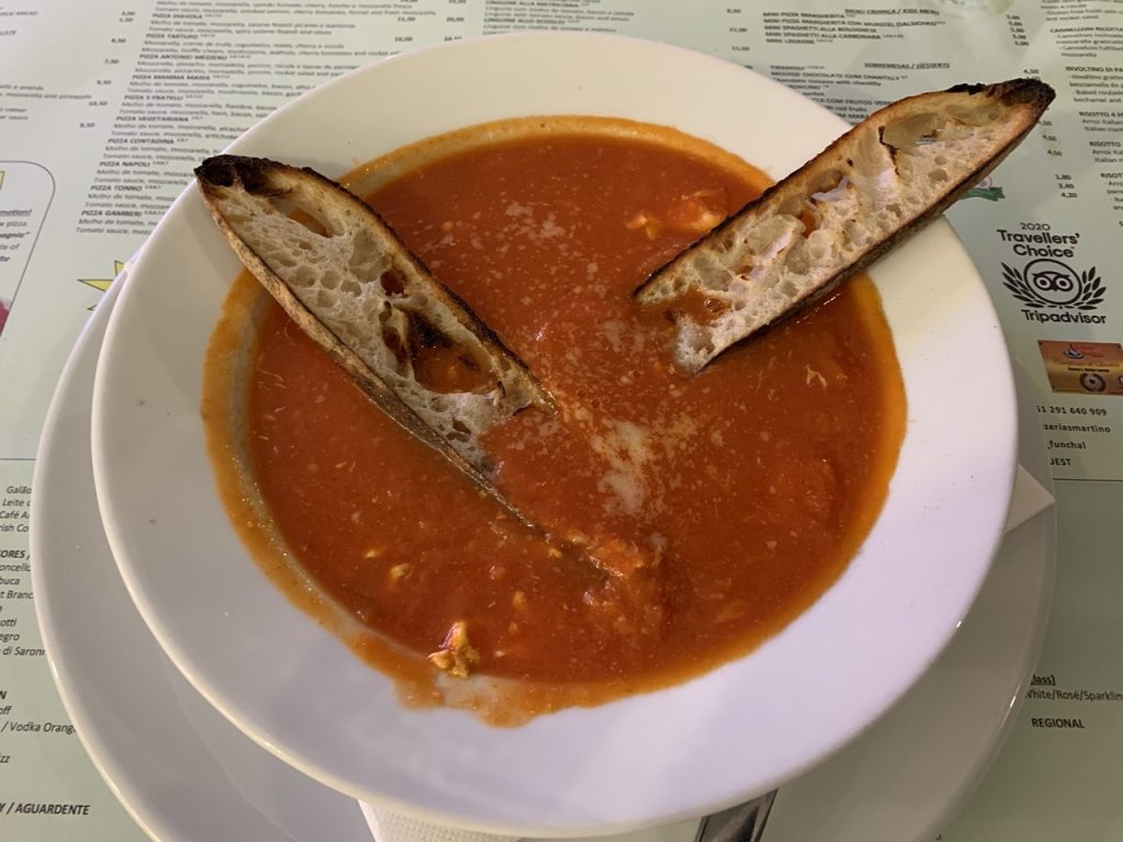Nunca resisto a uma sopa de tomate, mas daquelas a sério, com tomate fresco e vários temperos, a que se junta uma fatia de pão torrada com azeite, a dar a crocância ao caldo de tomate, bem quente. Maravilhoso!