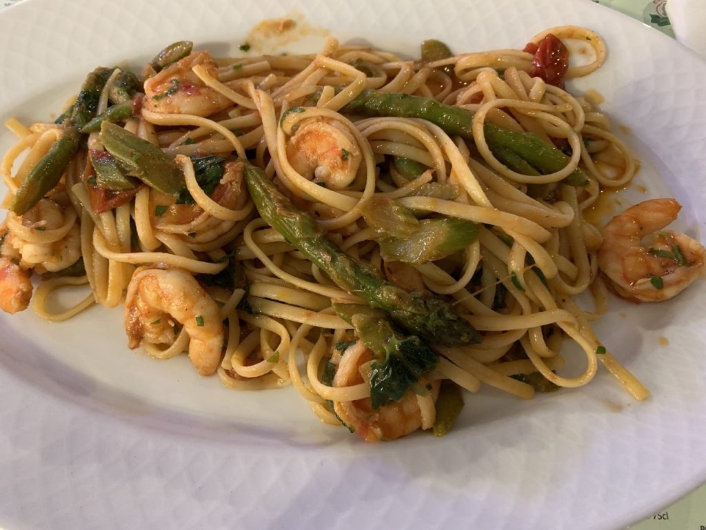 Depois ou vou por uma pizza (enorme), que costumo deixar ao cuidado do Carmine, ou uma das muitas pastas frescas: tortellini alla pana, linguine alla matricial, tagliatelle della nona, e tantos outros. Da última vez foi-me servido um linguini com tomate, espargos verdes e gambas, levemente picante, que estava fantástico. Eu, atrevido, ainda acrescentei um pouco mais do excelente picante que a casa tem, e fiquei a suar…